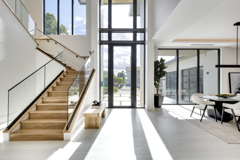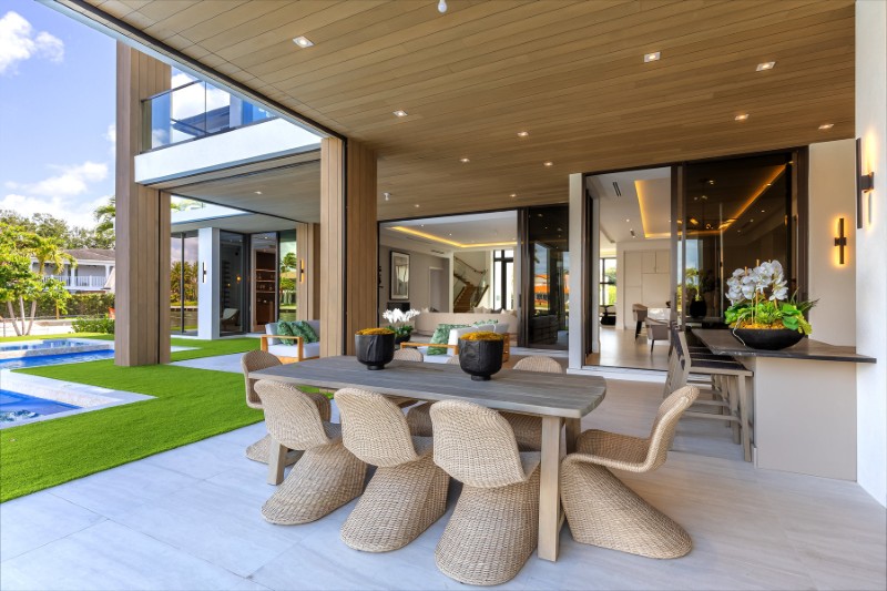 Designed by Randall Stofft and built by Beth Geduld, the residence blends open-air living with refined interiors over ~9,200 total sq. ft.
