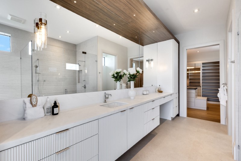 - Primary suite: separate his/hers-style bathrooms; dual walk-in closets; private outdoor shower