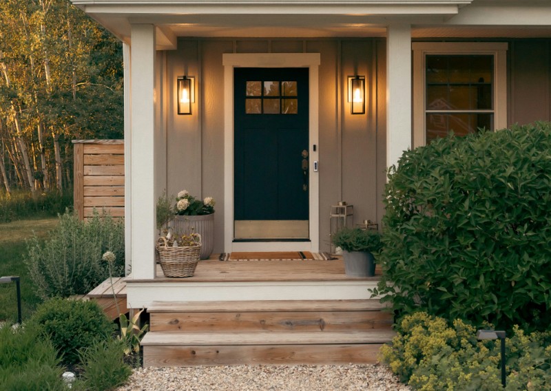 Если в качестве освещения у входа используется небольшой, ничем не примечательный фонарь, дом мгновенно воспринимается как простой, даже если все остальное выглядит красиво.