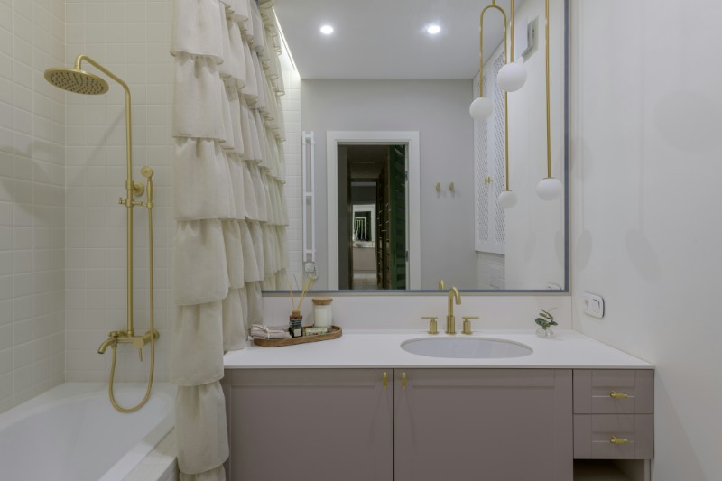 Душевая лейка с эффектом дождя, улучшенная ручная душевая лейка или просто более массивная сантехника могут придать ванной комнате гораздо более роскошный вид, не меняя при этом плитку или сантехнику. Дополнительные баллы, если аксессуары сочетаются по стилю, а отделка выдержана в едином стиле.