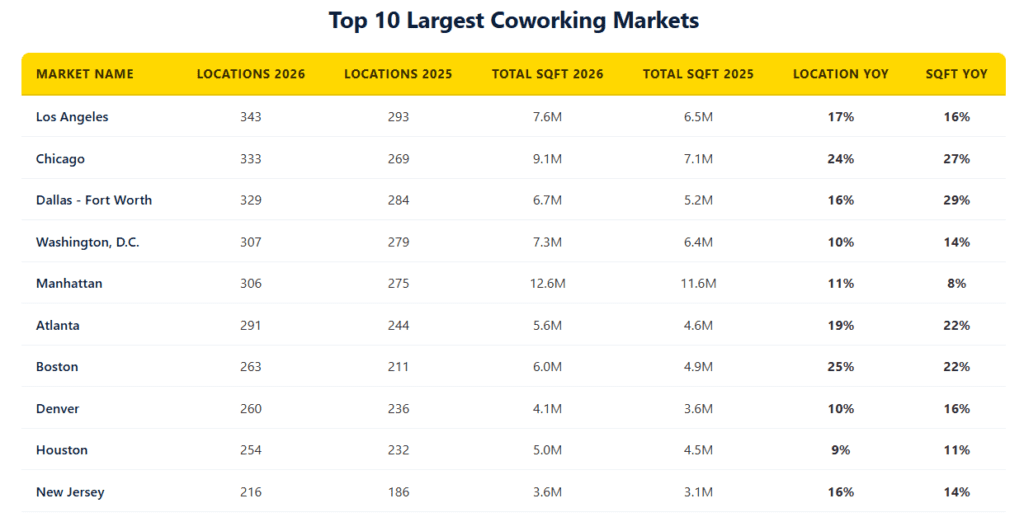 U.S. Coworking Market Expands Rapidly in 2025 According to new data by Yardi Kube, the U.S. coworking sector posted another year of strong expansion, reinforcing its transition from a niche workplace alternative into a core component of the modern office market. Between January 2025 and January 2026, the national coworking footprint grew to 8,973 locations, up from 7,776 a year earlier -- a 15% increase....