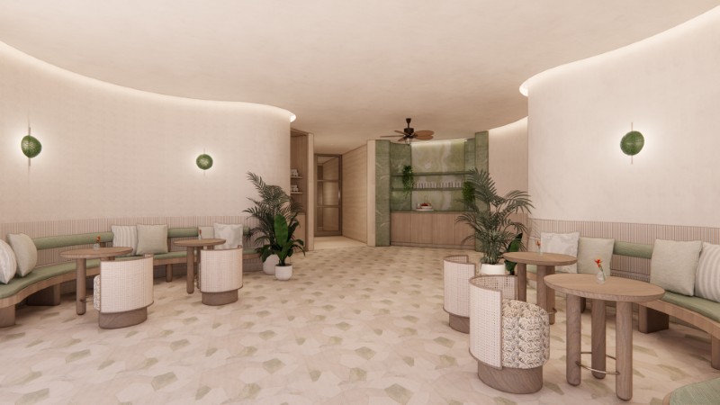 A juice bar and adjacent relaxation area support daytime use of the pool deck and post-workout refreshment.