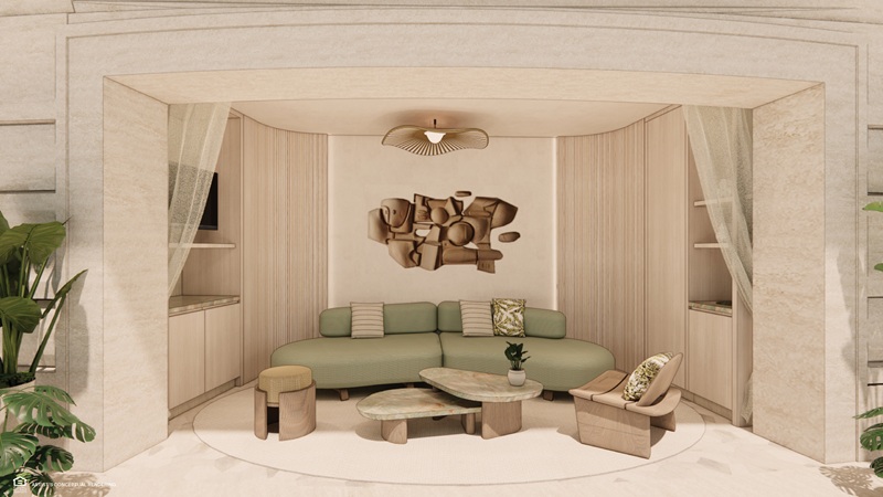 Across amenity areas, white travertine and satin plaster are paired with azure tones that reference the bay and shoreline, consistent with the project’s coastal and Streamline Moderne cues.