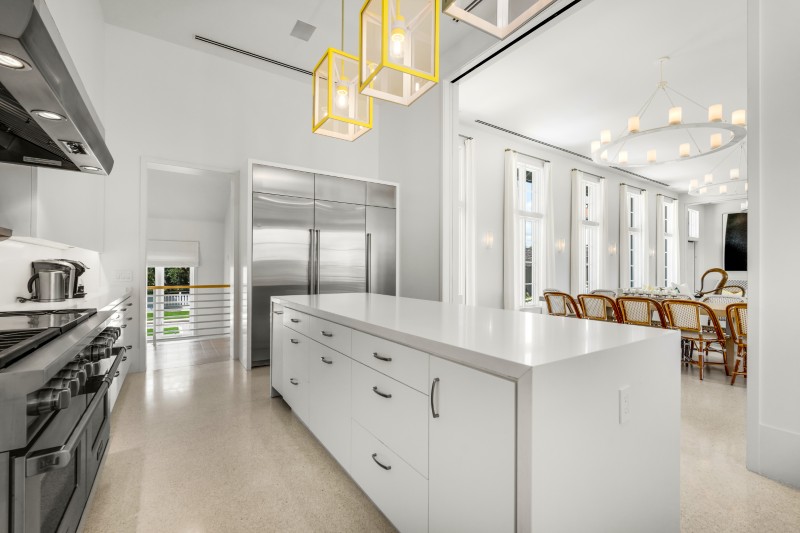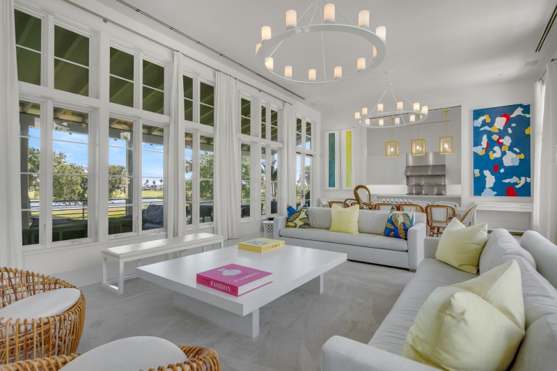 Despite its capacity, the room feels approachable, thanks to woven dining chairs and simple finishes that embrace the community’s breezy, coastal aesthetic.