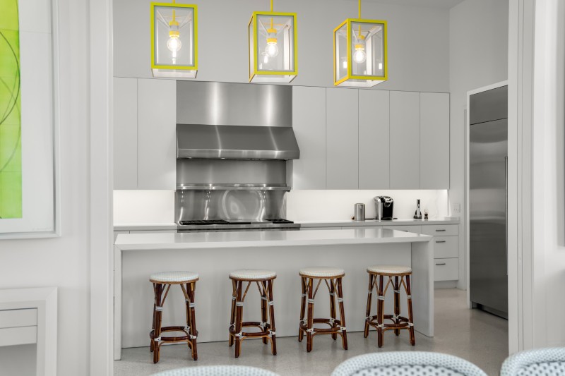 Bright touches — including bold yellow pendant lights — add a layer of personality, highlighting a theme repeated throughout the estate: serious architecture paired with cheerful, unfussy interior design.
