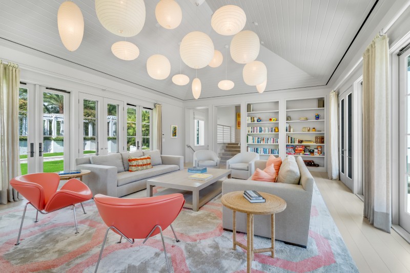 A separate living pavilion functions as a family lounge, library, and game space. Pendant lanterns cluster playfully from the ceiling, while built-in shelves house books, puzzles, and games — an architectural wink to the property’s multigenerational purpose.