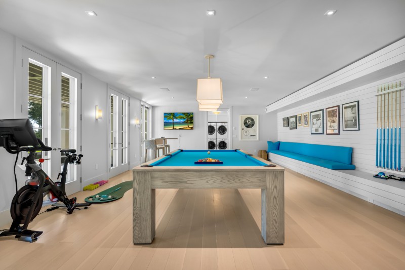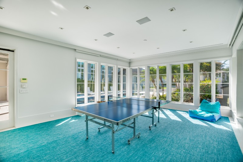Just off the courtyard, a dedicated ping pong room brings a breezy, clubhouse energy to the estate. Wrapped in windows and finished with aqua-toned flooring, the space feels almost like an indoor cabana.