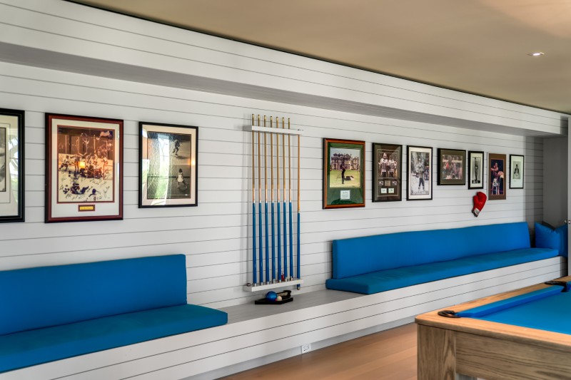 Framed sports memorabilia adds personality, while a full-size pool table anchors the space. It’s the kind of room that can shift from family hangout to after-dinner tournament without missing a beat.