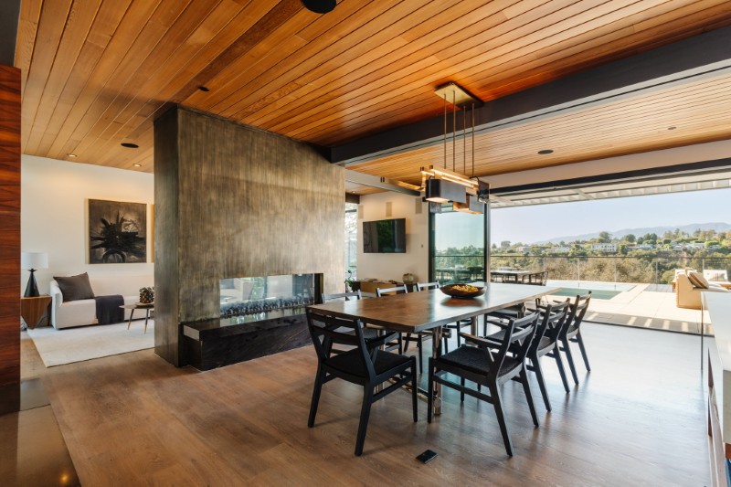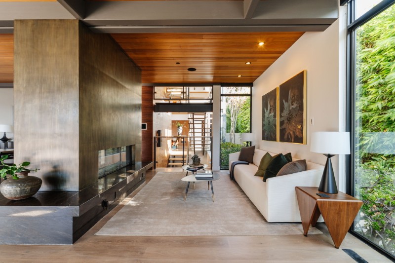 The open-concept living and dining areas revolve around a two-way Corten steel fireplace with a marble hearth, balancing industrial design with natural warmth.