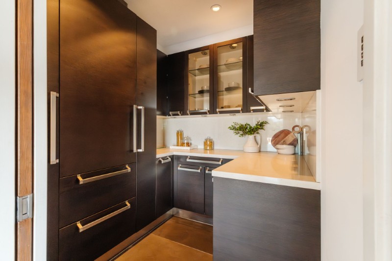 The home’s Arc Linea chef’s kitchen makes a striking statement with its Crocodile Caesarstone backsplash, marble island, and professional-grade Wolf and Miele appliances. Beyond the kitchen, a butler’s pantry and bar setup enhance the home’s entertaining capabilities.