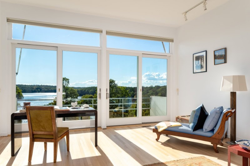 Стеклянные стены, мансардные окна и французские двери наполняют интерьер светом и открывают виды на закат.