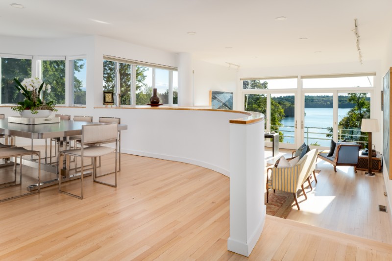 Длинный вестибюль/галерея с высокие потолки и мансардные окна сразу привлекает взгляд к воде, а стены по всему дому, готовые к размещению галерей, обеспечивают непрерывное пространство для произведений искусства.