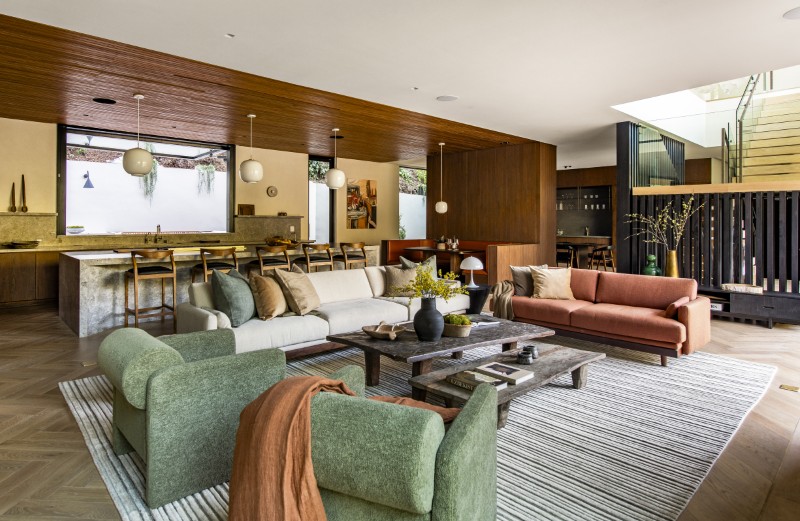 The adjoining living area, connected to expansive decks and lounge zones, reinforces the home’s philosophy: modernism with softness, architecture that breathes.