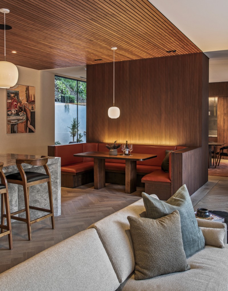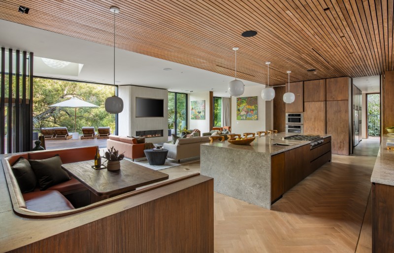 The kitchen is a centerpiece — a chef’s space that still feels visually quiet, with a 15-foot custom stone island, Miele appliances, a built-in breakfast nook, and an automated pass-through window for seamless outdoor dining.