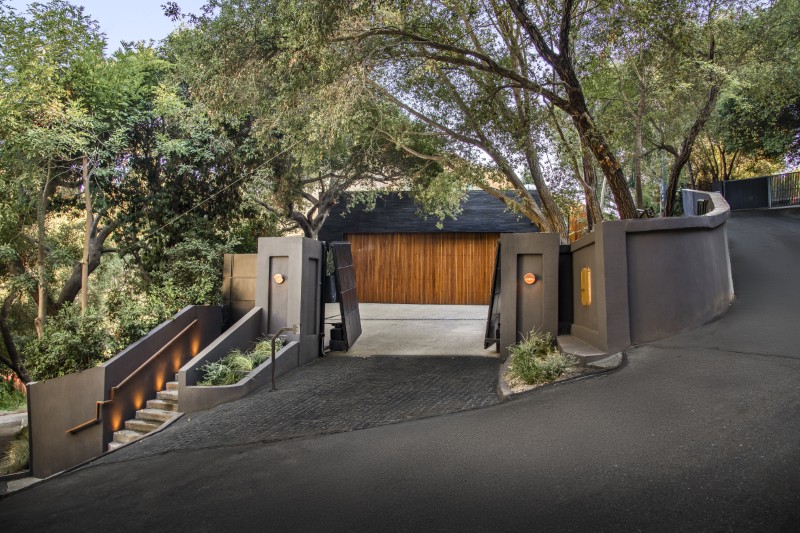 A blackened façade, mature oak trees, and sculpted concrete walls create a low, quiet entry sequence before the home opens dramatically behind the gates. The driveway leads to a three-car showcase garage — complete with architectural lighting — and signals immediately that this isn’t a standard spec build.