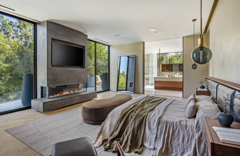 The primary suite channels a full private spa, complete with a custom birchwood sauna, steam rain shower, dual closets, and a plastered floating fireplace.