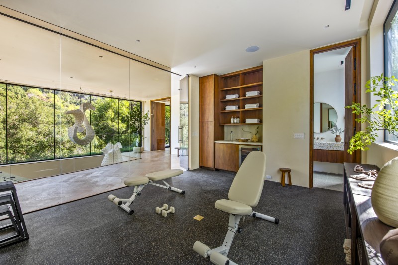 A tiered theater, fully equipped home gym, temperature-controlled wine storage, secondary chef’s kitchen, and additional lounge spaces round out the property’s recreational offering.