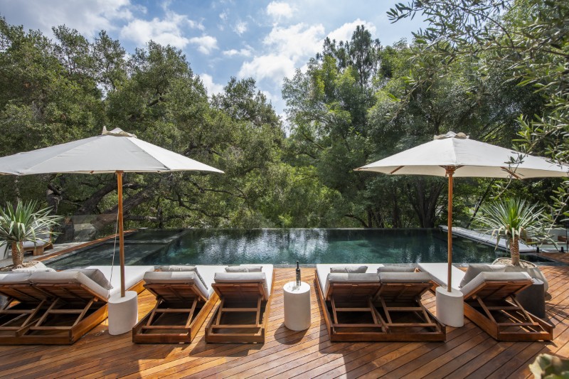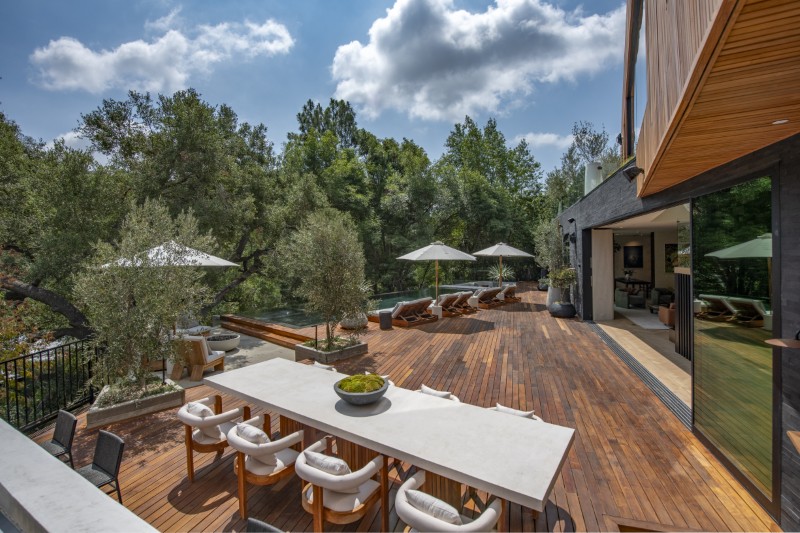 A secluded terrace overlooks canyon greenery, reinforcing the connection to the landscape. Four additional ensuite bedrooms extend to outdoor decks of their own, maintaining the home’s visual rhythm.