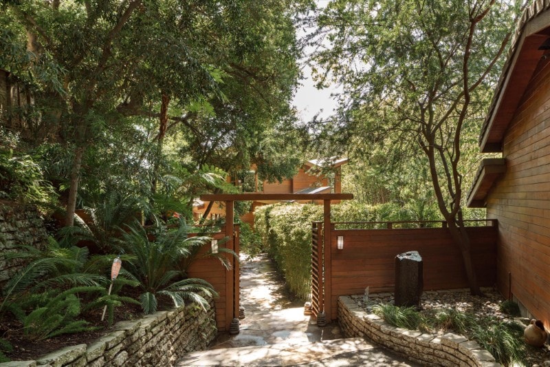 Winding pathways weave through mature landscaping, creating a secluded atmosphere that feels far removed from the city despite its central location.
