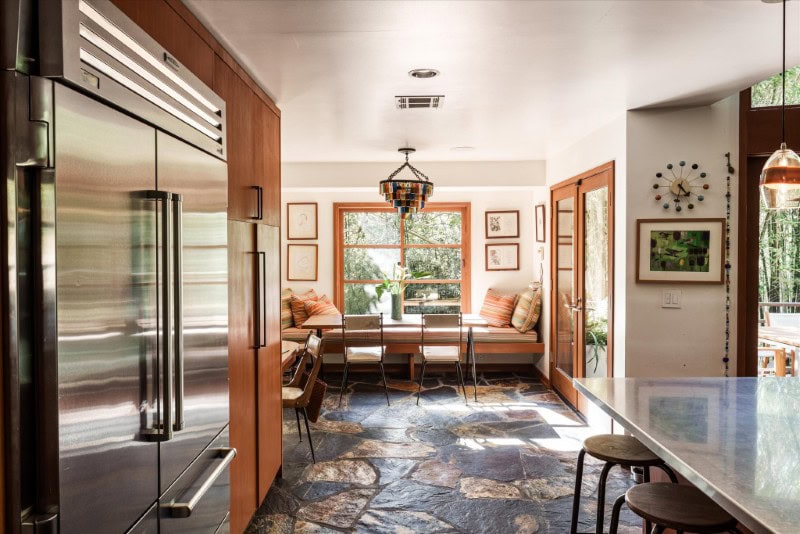 From the main living spaces, the surrounding Nichols Canyon landscape becomes a constant backdrop, with mature trees and forested hillsides visible in nearly every direction.