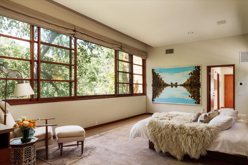 The home’s layout centers around a secluded primary suite positioned in its own wing, with large windows taking in the outside greenery.