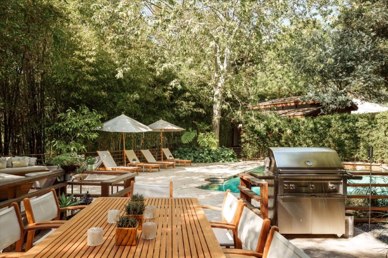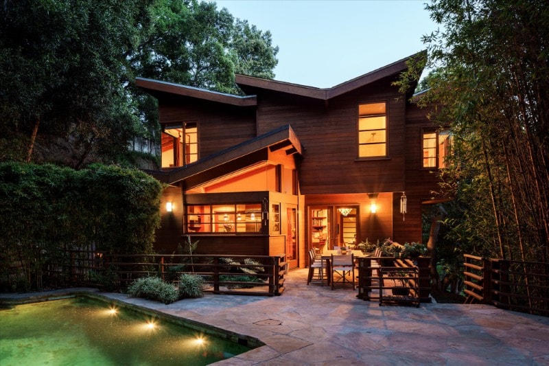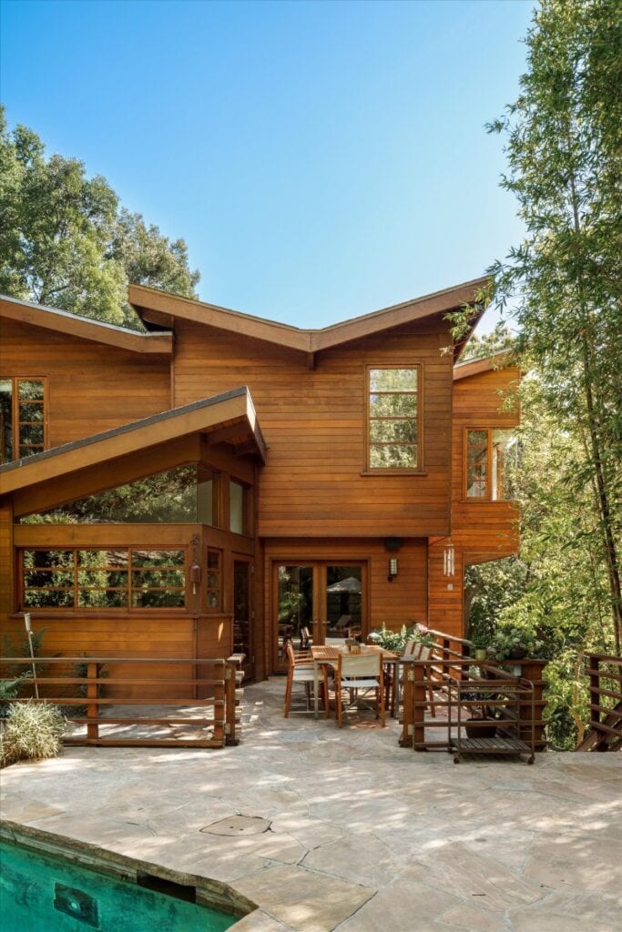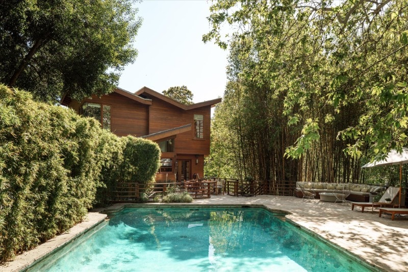 Set within the greenery of Nichols Canyon, the pool area is as a secluded retreat surrounded by trees and hillside views.