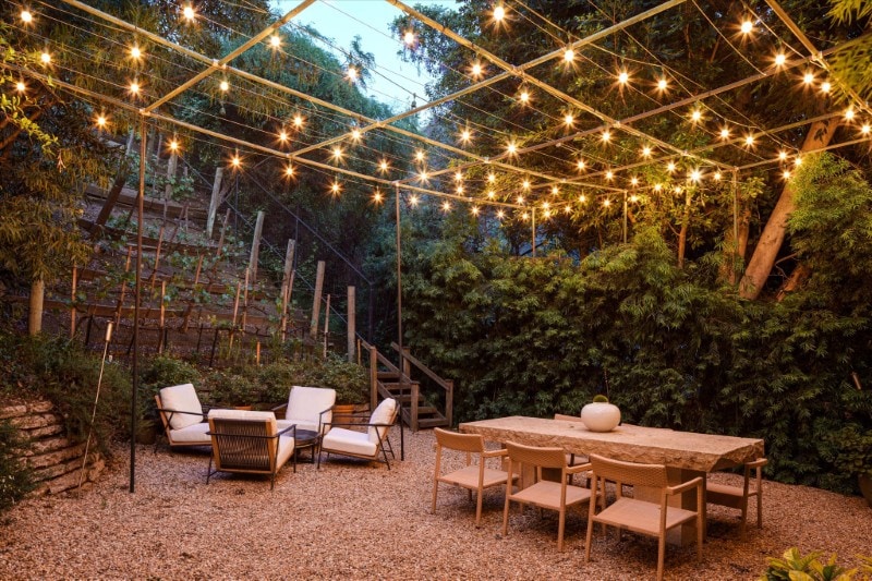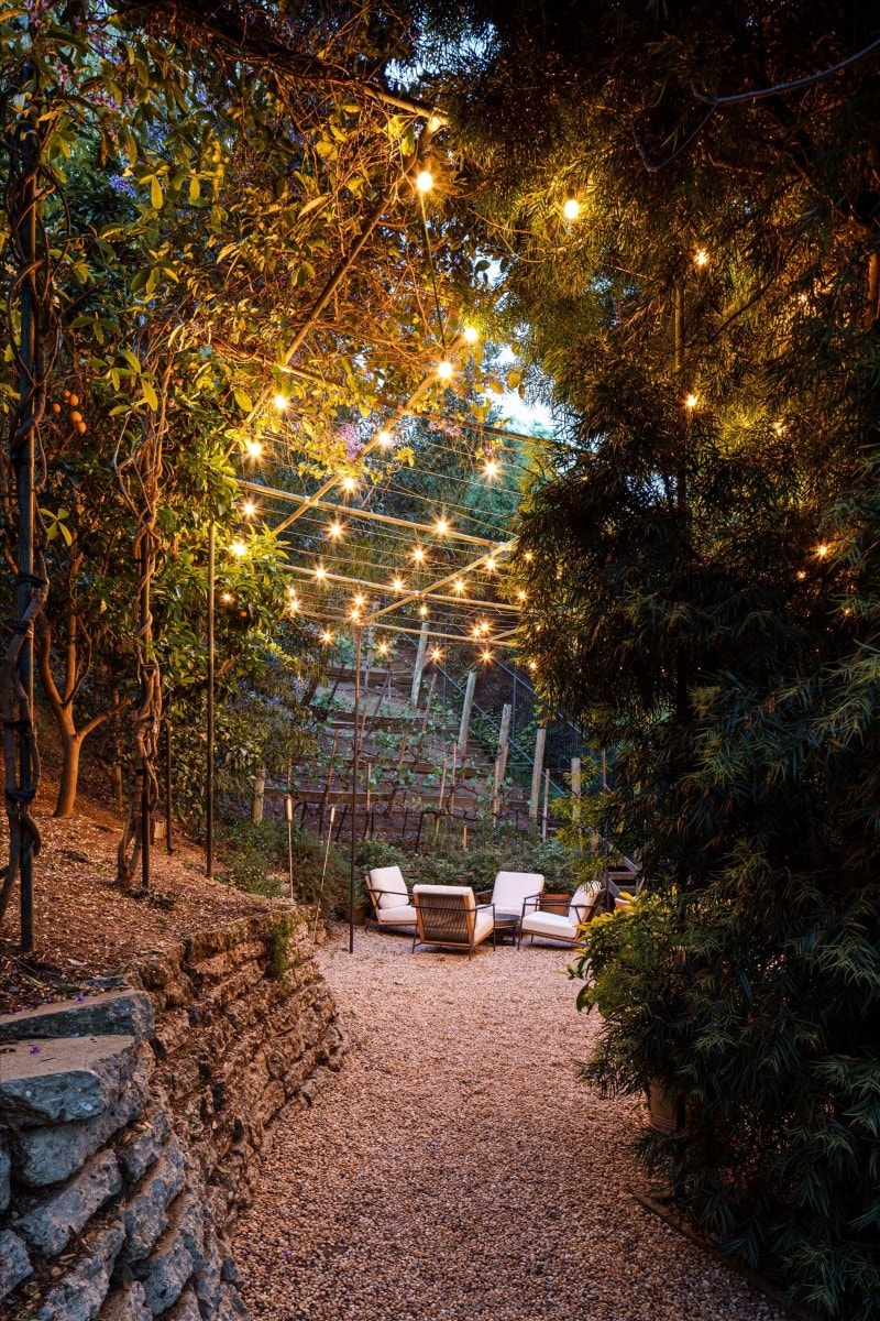 The vines overlook an alfresco dining terrace set among fruit trees, creating a setting designed for long outdoor meals and gatherings.