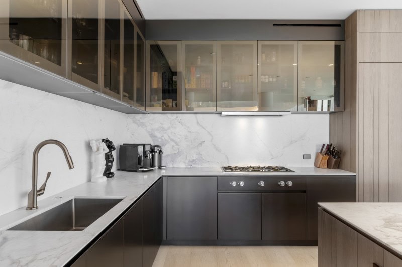 The kitchen is built around a bespoke Poliform design, pairing custom cabinetry with marble countertops and integrated high-end appliances from Gaggenau.