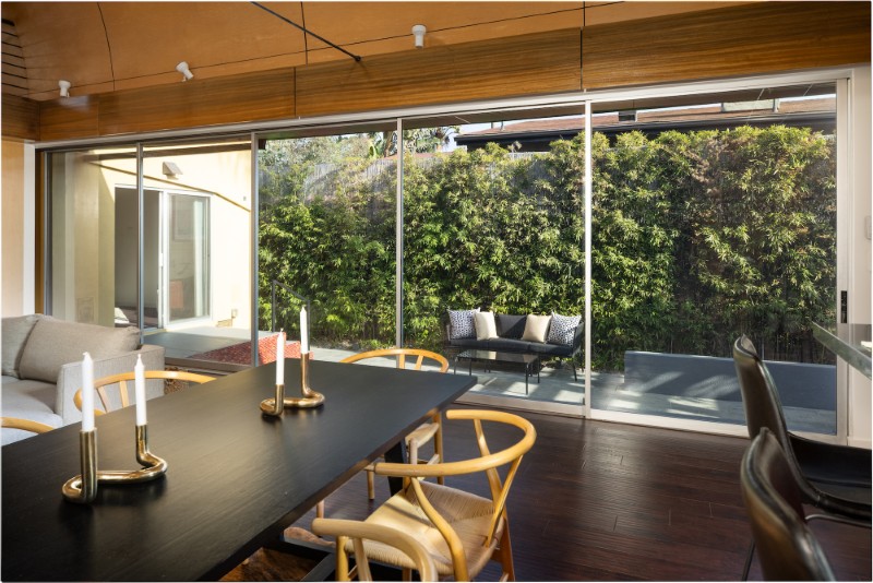 Стена из раздвижных стеклянных дверей открывает большую комнату дома во двор с бассейном, обеспечивая плавный переход между внутренним и внешним пространством.
