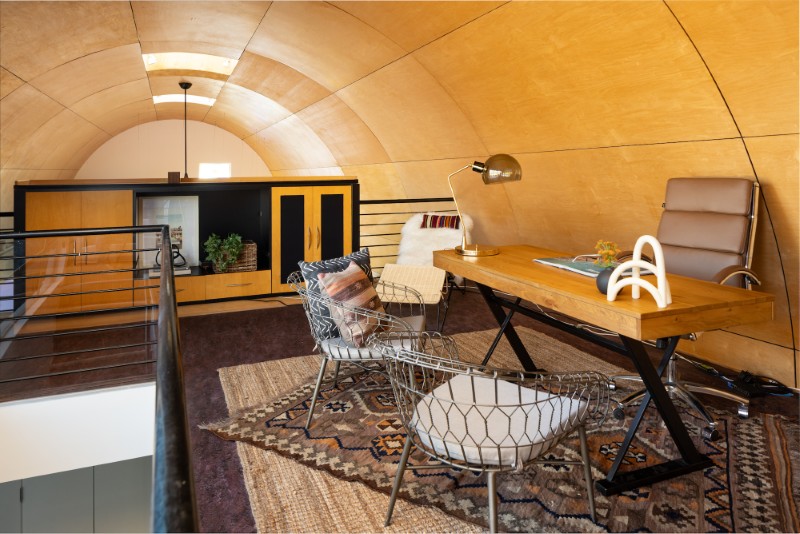В центре дома находится эффектный двухэтажный сводчатый потолок, обшитый кленовым шпоном для улучшения качества звука и теплоты.