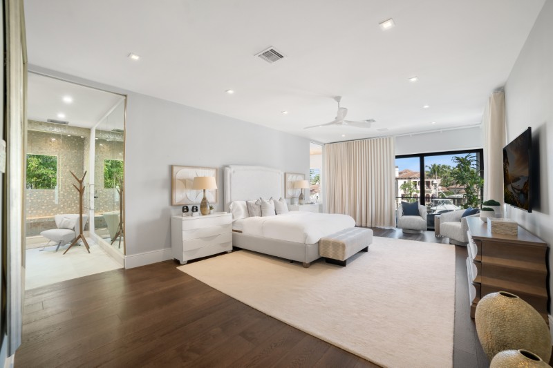 The Главная спальня занимает просторную площадь., которая открывается в светлую гостиную, обрамленную широкими раздвижными стеклянными дверями с видом на канал.