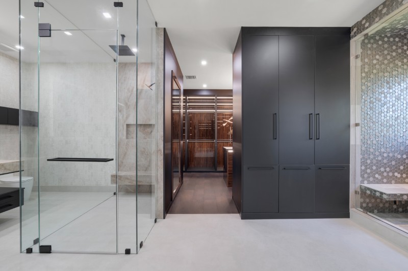 За душевыми кабинами номер плавно переходит в пару элегантных гардеробных, оформленных в теплых древесных тонах (темных и мрачных для него, светлых и ярких для нее). Встроенная подсветка освещает каждую полку и панель для хранения, создавая ощущение роскошного бутика.