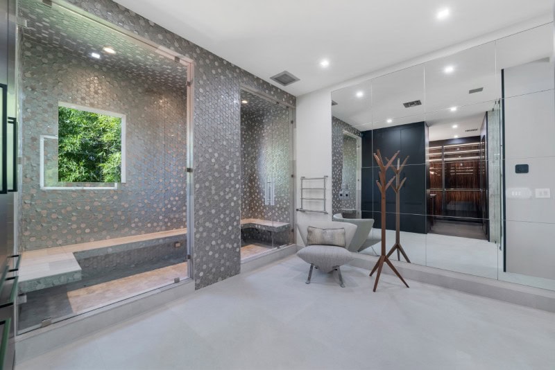 Вдоль каждой клетки расположены встроенные скамейки. подчеркивая намерение создать атмосферу спа-салона.Вместе эти два паровых помещения создают шедевр, редко встречающийся в дизайне жилых помещений.