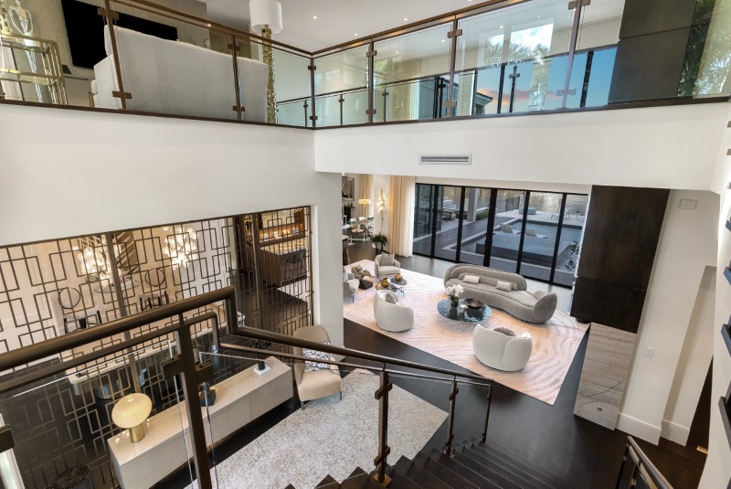 Металлические перегородки, изготовленные на заказ, отделяют эту зону от главной лестницы, добавляя архитектурную изюминку и сохраняя при этом обзор. Встроенная барная ниша соединяет это помещение с остальной частью дома, предназначенной для приема гостей.