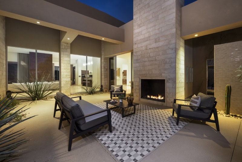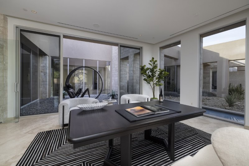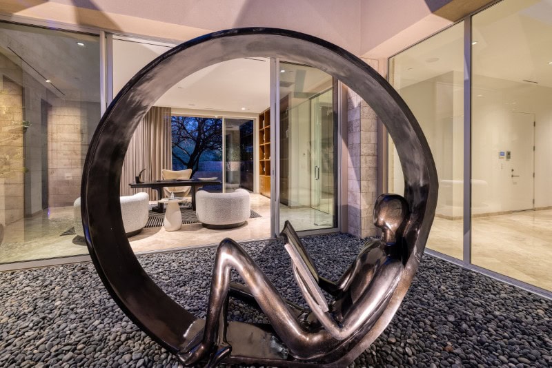 A glass-lined entry frames views of Red Rock Canyon, while water features run through the property, creating a continuous visual and spatial thread. Courtyards serve as both transitions and destinations, bringing light and air into the center of the home.