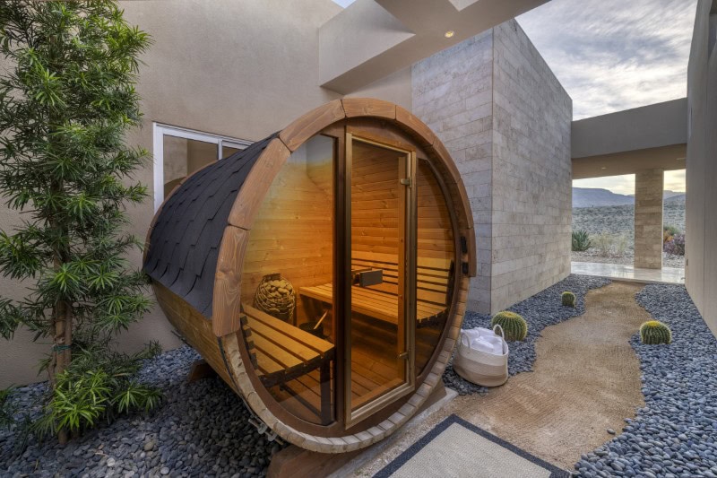 A full wellness component is integrated into the home, including a gym, steam room, and barrel sauna.