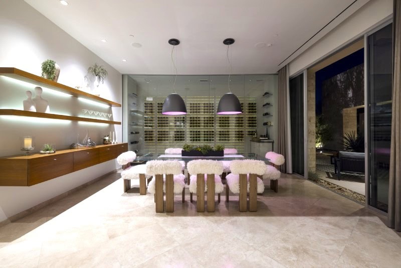 The dining space is flanked by a glass wine room featuring programmable color-changing Lucite pegs that display hundreds of bottles.