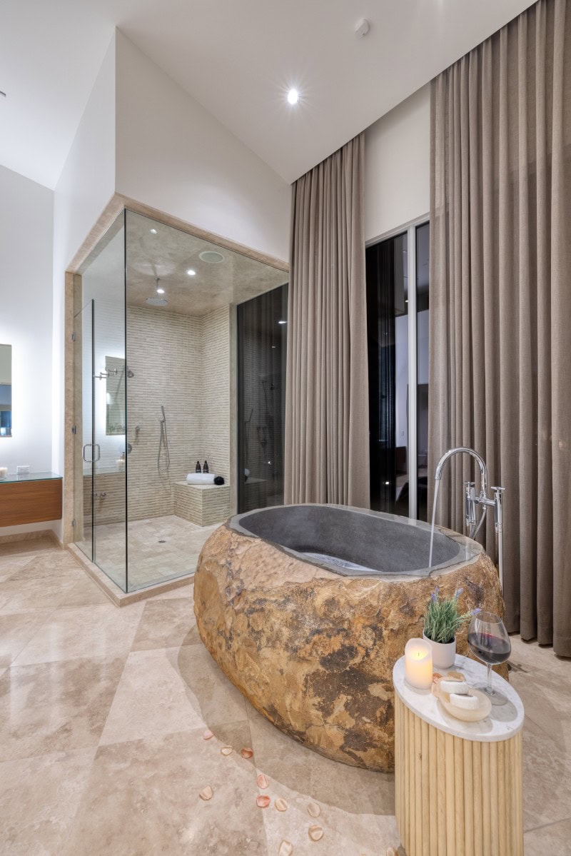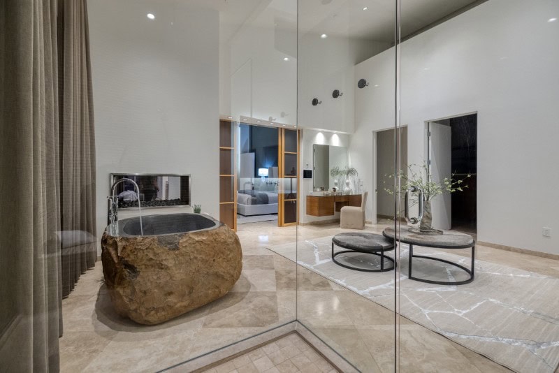 Our favorite part of the primary, though? That имеет to be the oversized bathroom, a huge space with sleek furnishings, a glass-enclosed shower, and a stone bathtub.