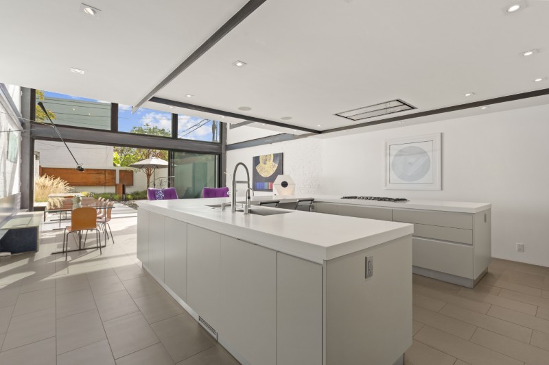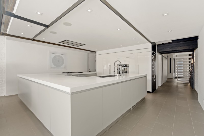 Кухня шеф-повара занимает основной этаж, оборудованный экологичной мебелью Pedini, высококачественной техникой, каменными столешницами и удивительно вместительными системами хранения. Она легко соединяется с обеденной и гостиной зонами как внутри, так и снаружи, поэтому ужины могут затягиваться допоздна, не создавая ощущения тесноты.
