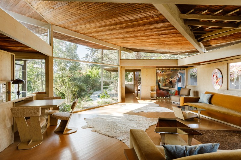 Built in 1949, it channels many of the architect’s core ideas: interlocking volumes, organic materials, and carefully calibrated sightlines that guide the eye outward toward the landscape. Its status as Historic-Cultural Monument #1024 underscores how significant it remains in L.A.’s architectural canon.