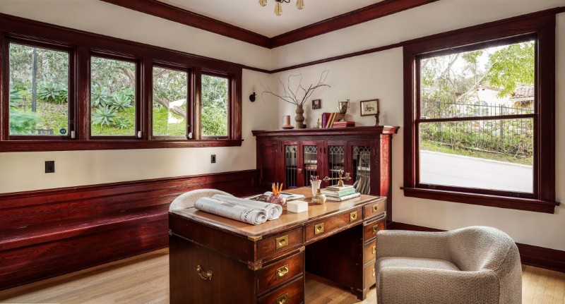 One of the home’s standout spaces is the study, highlighted for its original woodwork and preserved detailing.