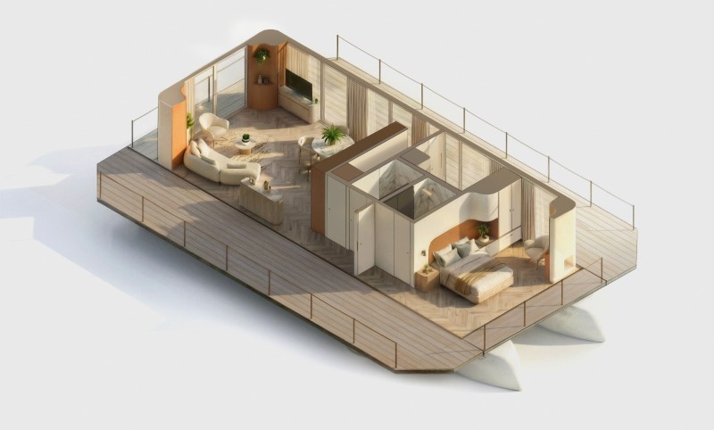 Instead, it’s built to function as real architecture placed directly on the water: stable, livable, flexible, and designed for everyday use as much as spectacle.