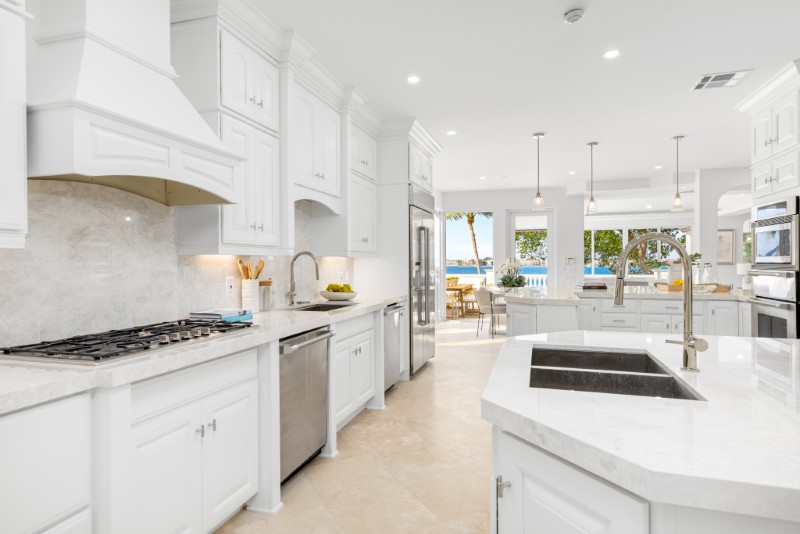 Outdoor spaces are designed around the Intracoastal side of the property, where a heated pool and spa overlook the water.