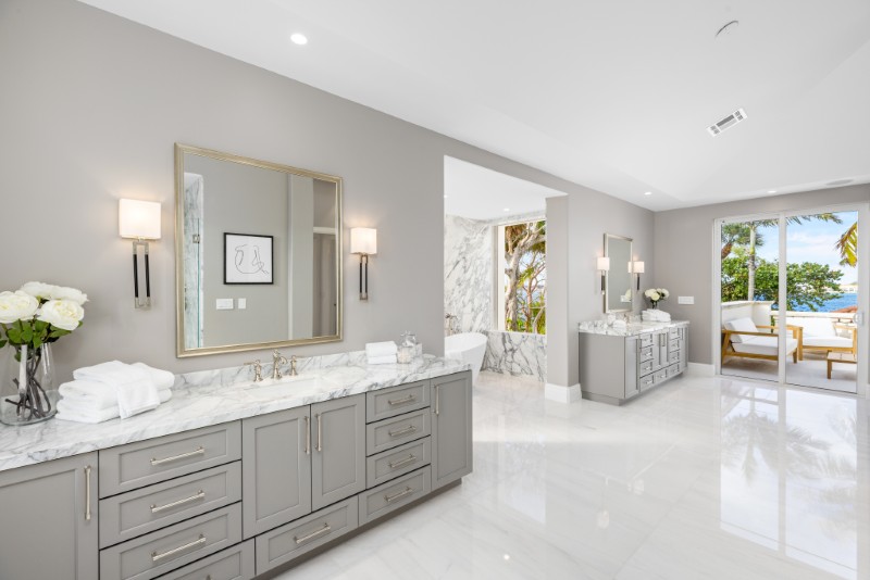 The renovated primary bath includes dual showers, a Roman tub, and separate water closets, reflecting the scale expected at this level of the market.