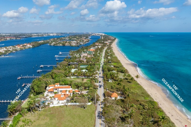 Located on the prohibitively expensive South Ocean Boulevard, the nearly two-acre estate spans the full width of the barrier island — with 150 feet of direct Atlantic Ocean frontage on one side and 150 feet along the Intracoastal Waterway on the other — a configuration so rare that only a handful of properties in the entire town share it.