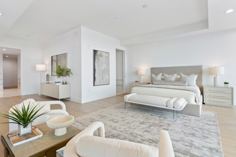Главная спальня расположена вдоль полоса стекла, выходящая на Окруженная внутрибереговым каналом, эта территория создает оазис, залитый естественным светом. Зона отдыха обрамляет вид на воду, а раздвижные двери ведут прямо на террасу.