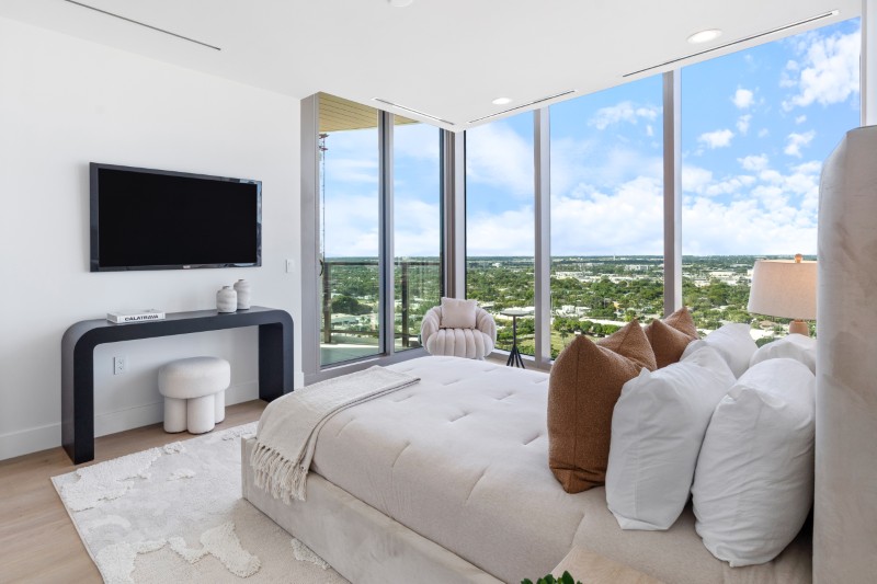 Само здание, Forté on Flagler, быстро стало одним из самых престижных новых адресов в Вест-Палме, и это конкретное место жительства Эта квартира выделяется своими масштабами, уникальной планировкой и редкой дизайнерской деталью: это единственная квартира во всей башне с двумя полноценными ванными комнатами, отделанными камнем Тадж-Махала.