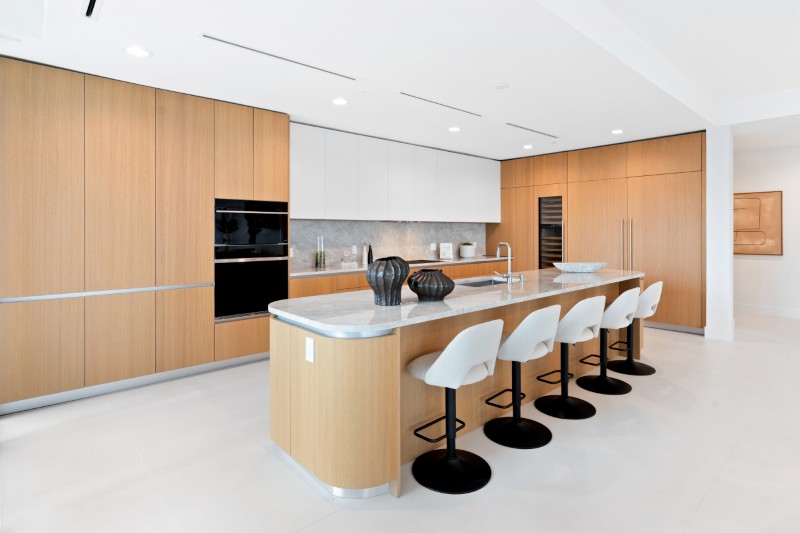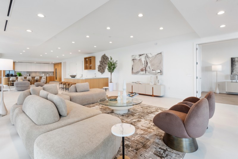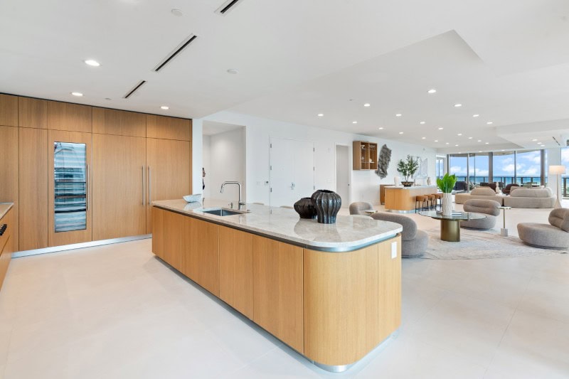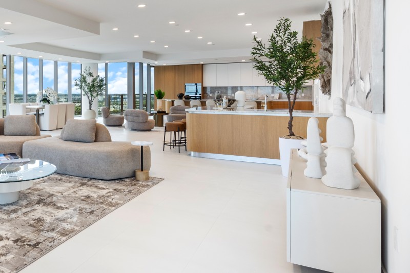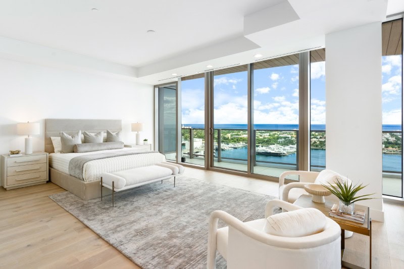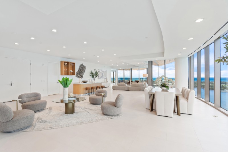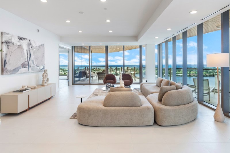 Окружающие основные жилые помещения стеклянные панели от пола до потолка образуют их периметр, плавно изгибаясь вокруг фасада здания и открывая вид на остров Палм-Бич, пристань для яхт и Атлантический океан.