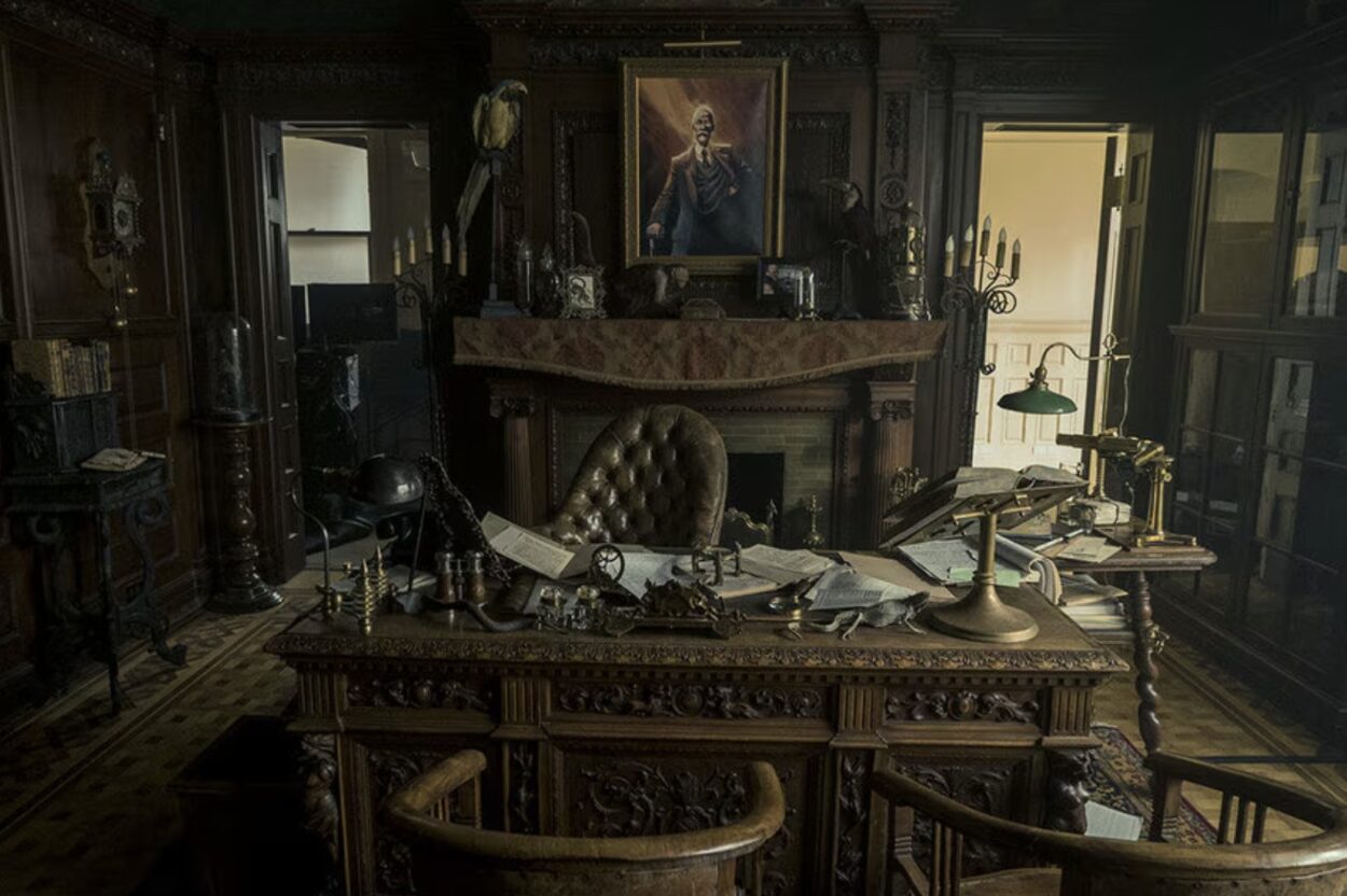 The whole room screams “eccentric billionaire genius,” with vintage globes, brass details, and just enough moody lighting to hint at family trauma.
