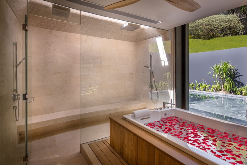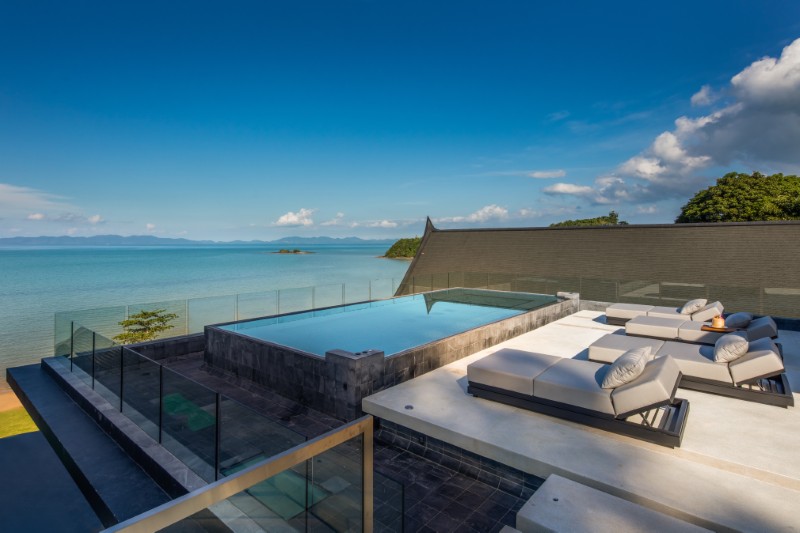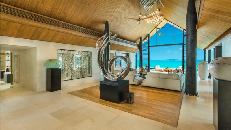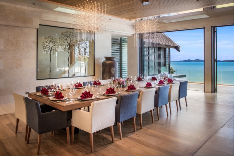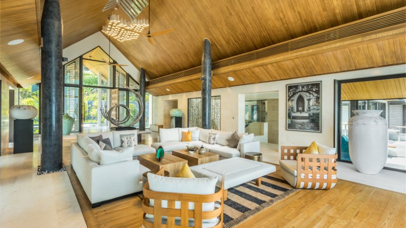 Первое впечатление задаёт тон: плавающие над водой дорожки ведут к современной интерпретации тайского входа с двускатной крышей. Внутри дизайн переходит в чистый скандинавский стиль с панорамными окнами, большими стеклянными панелями и эффектными произведениями искусства.